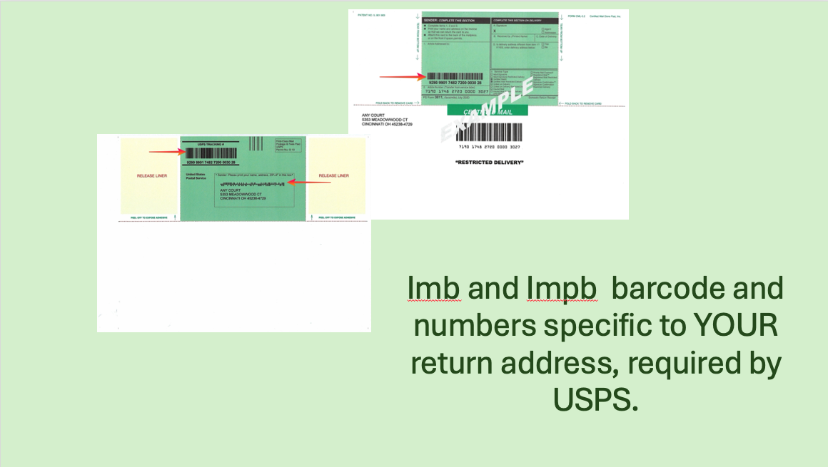 - Pre-printed information includes specific information for your address like Tracking Numbers, Imb and Impb barcodes and numbers currently required by the USPS.